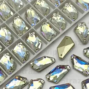 Пришивные стразы - крупные камни разнообразных форм: стразы Rivoli (круглые стразы с конусным верхом), стразы Xilion (классическая форма страз), стразы Drop (капли), стразы Navette ("маркизы", "глазки", "лодочки"), стразы Galactic ("топорики"), стразы Cosmic (неправильный ромб), стразы Quadra (квадрат), стразы Triangle (треугольник), стразы Leaf (лепесток).
